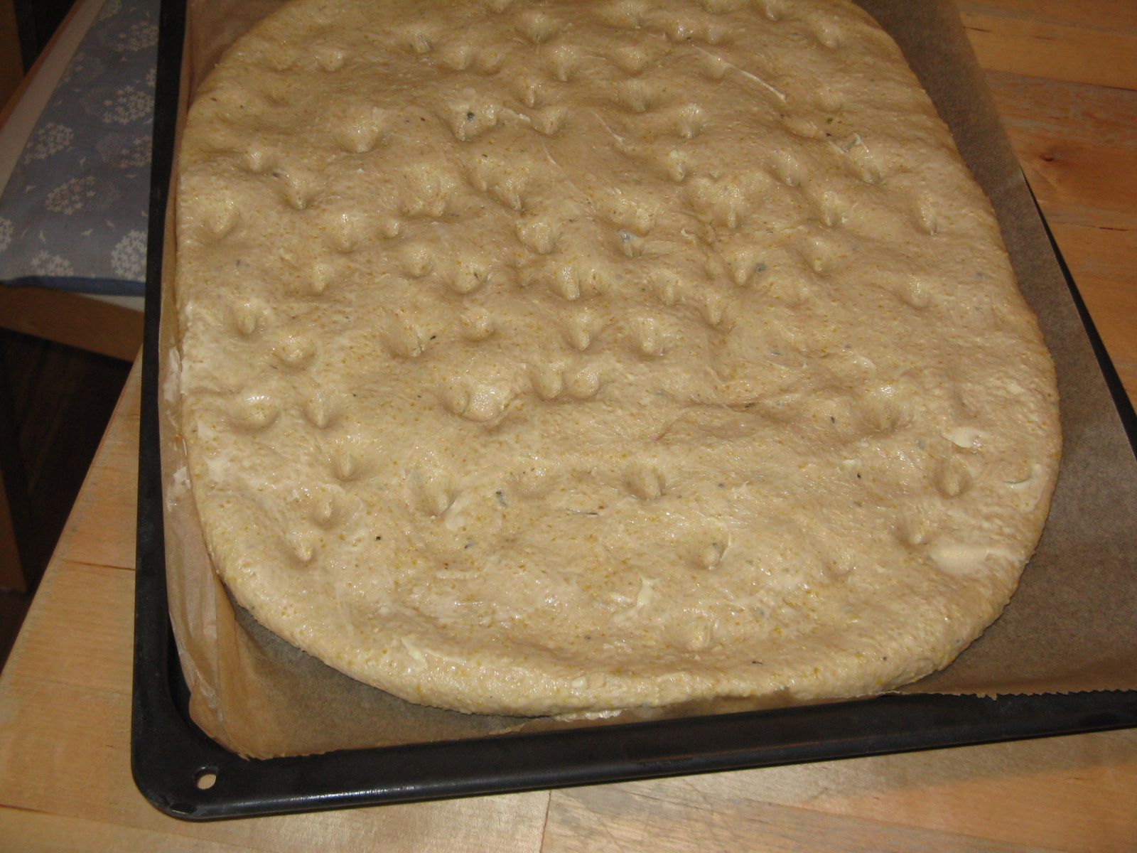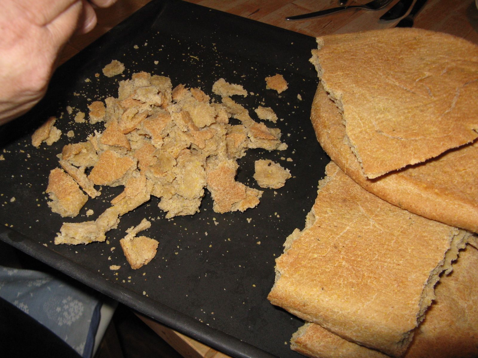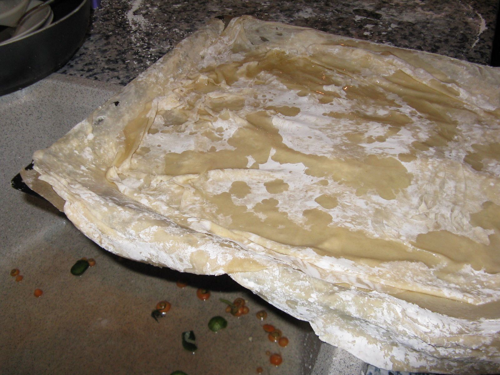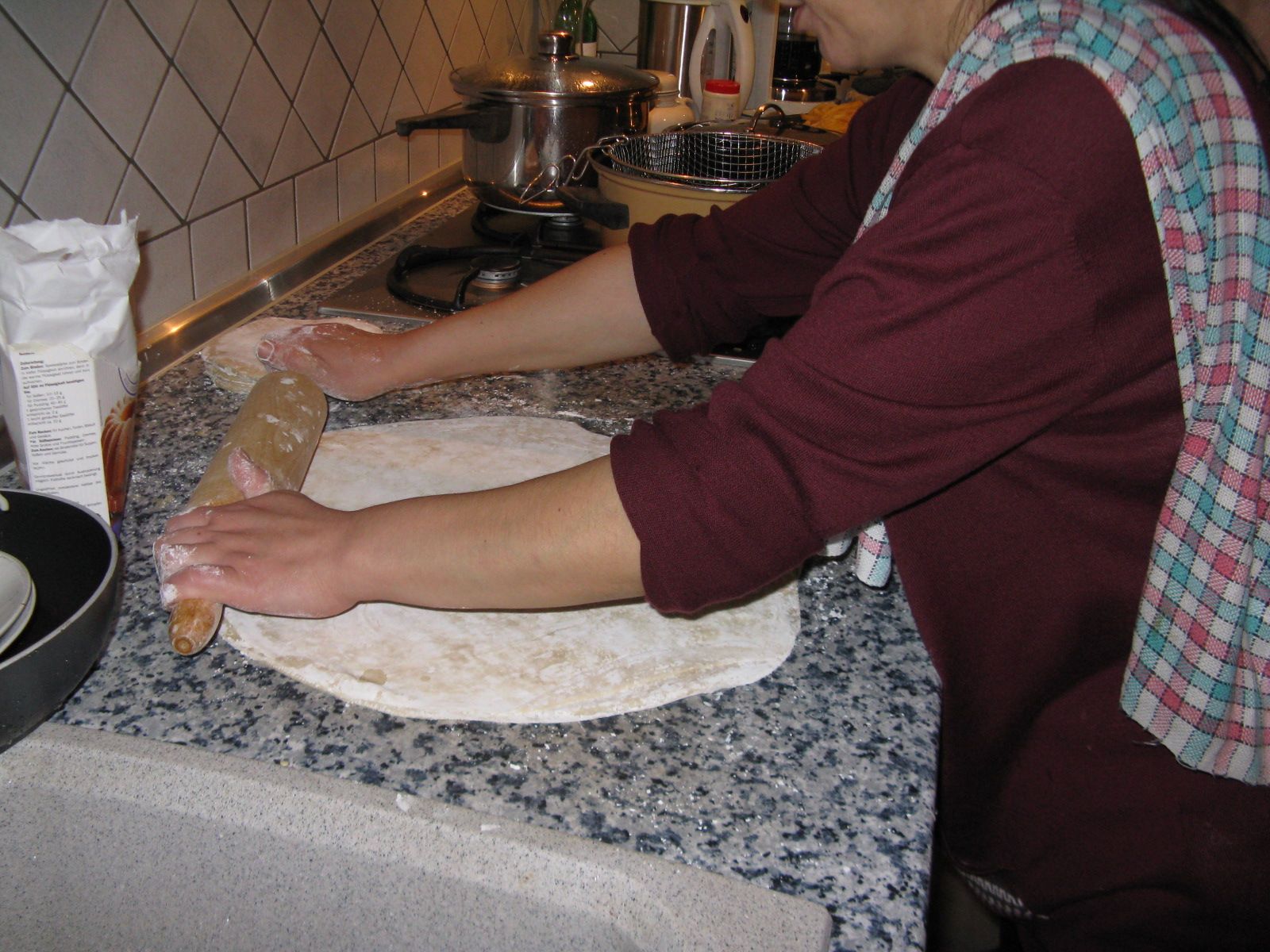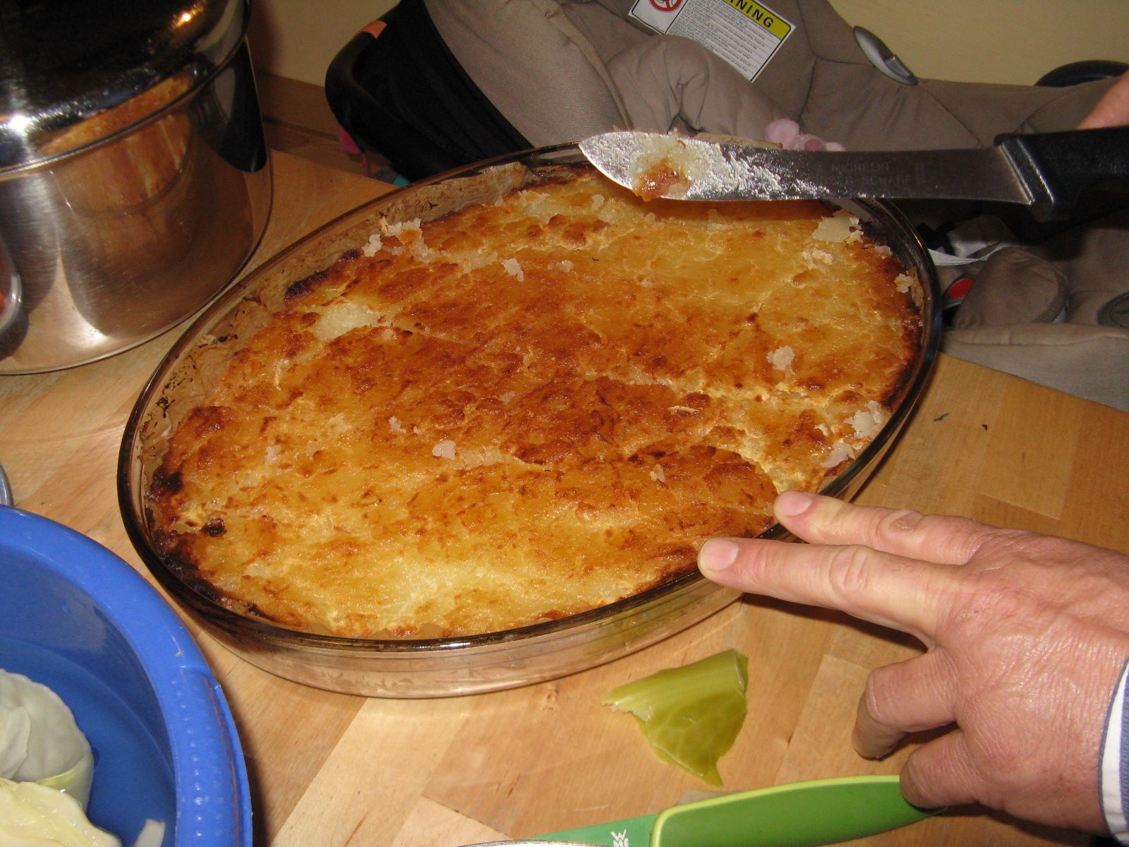 Für den Nachtisch wurden Milch, Wasser, Zucker und Speisestärke zu gleichen Teilen mit etwas Butter gekocht. Es entstand eine Masse, die – ist echt so! – einen sofort an Pattex erinnert. Sie wurde danach auf dem Backblech am Boden!!! (mangels Platz auf allen Küchentischen) durchgeknetet und in unsere größte Auflaufform gefüllt, dann im Backofen gebacken, lecker knusprig obendrauf, für deutschen Gaumen supersüß.