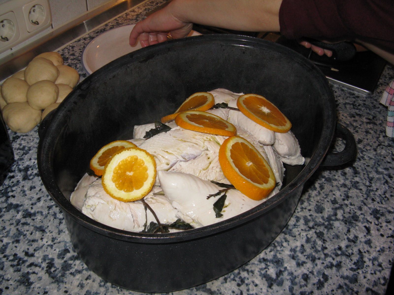 Puldeti ist Truthahnfleisch mit Orangen und Minze. Die Putenfilets werden im Wasser gekocht, dann im Bräter mit Orangenscheiben und Pfefferminze bedeckt im Backofen fertig gegart.