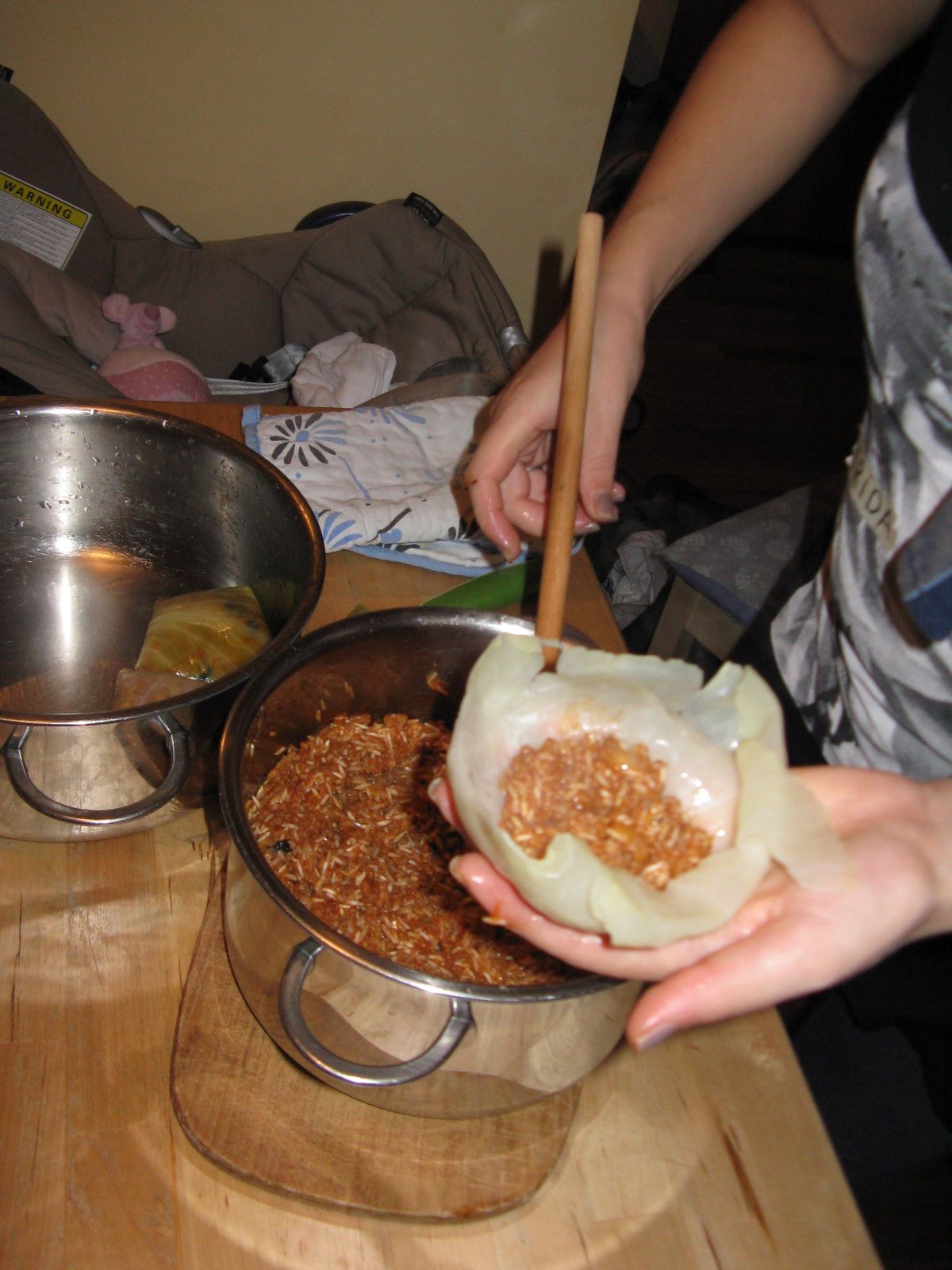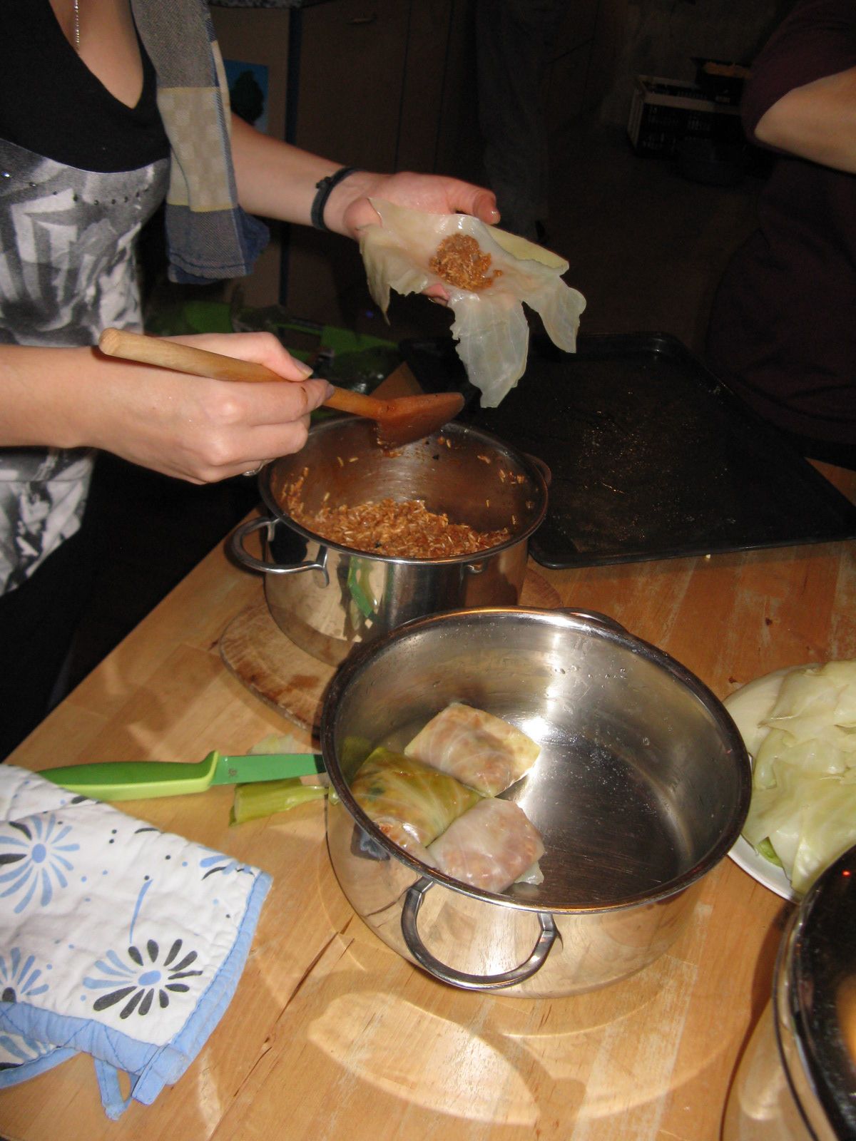 Dollmo sind mit Reis, Tomate und Knoblauch gefüllte Kohlblätter. Es war gar nicht so leicht, die Kohlblätter einzeln und intakt abzulösen. Auch nach langem Kochen blieb es schwierig. Diue gefüllten Kohlpakete wurden danach noch mit Wasser bedeckt im Topf zu Ende gekocht.