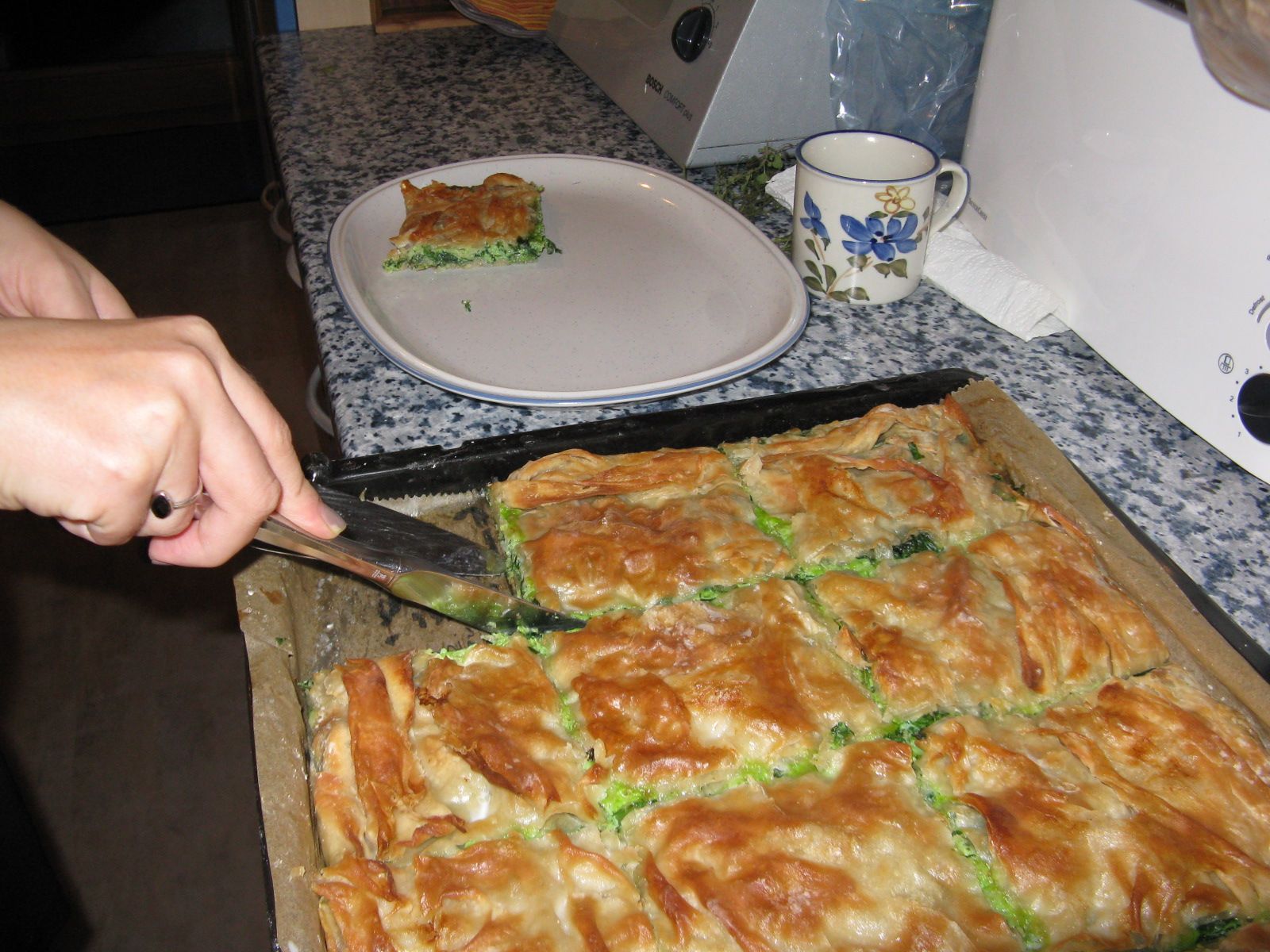 Es war echt lecker, ganz besonders das Byrek mit Spinat: ich hatte vorher noch nie gesehen, wie man selbst Blätterteig macht, doch das dauert und braucht „Muckies“. Ich wusste nicht, dass Blätterteig nur aus Mehl, Wasser, Öl und Salz besteht. Das Kneten der zähen Masse sieht schon anstrengend aus, der ganze Teig wurde in 8 Kugeln aufgeteilt, jede ergab beim anschließend echt schweißtreibenden hauchdünnen Auswellen eine Schicht: 4 dieser Teigschichten bildeten den Boden, dazwischen die Spinatmasse aus frischen Spinatblättern, obenauf nochmal 4 Teigschichten.