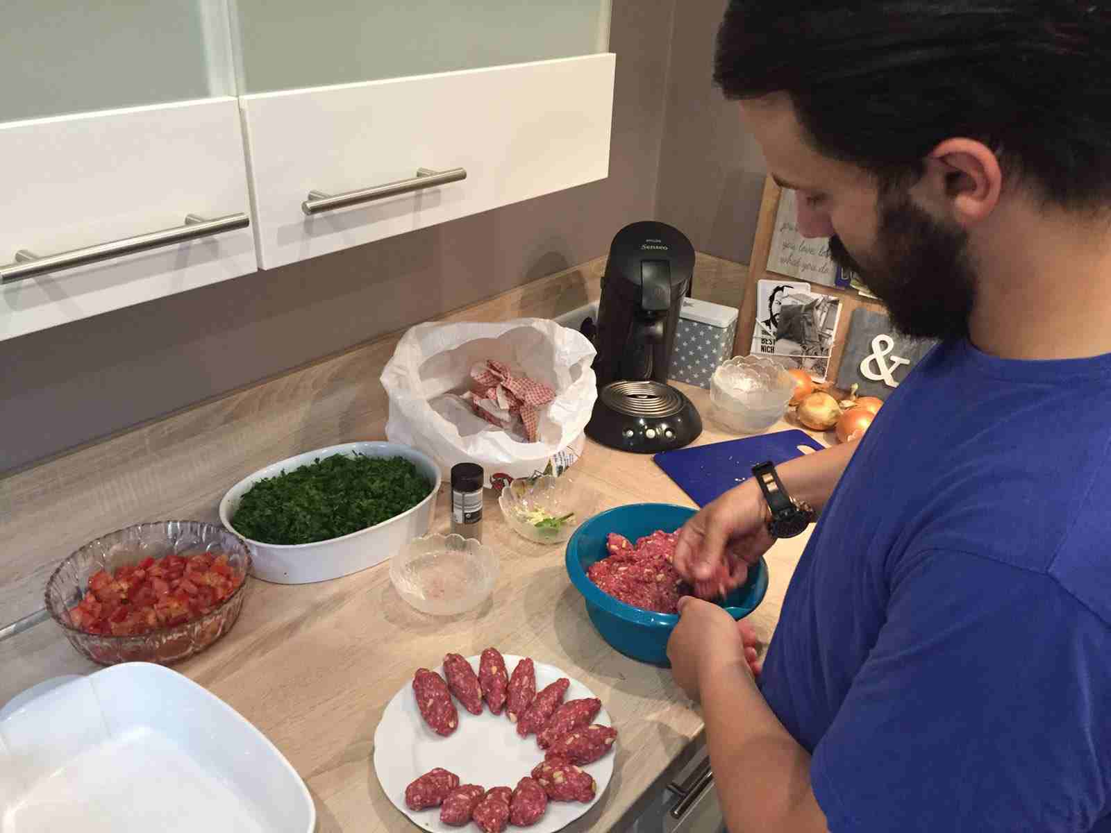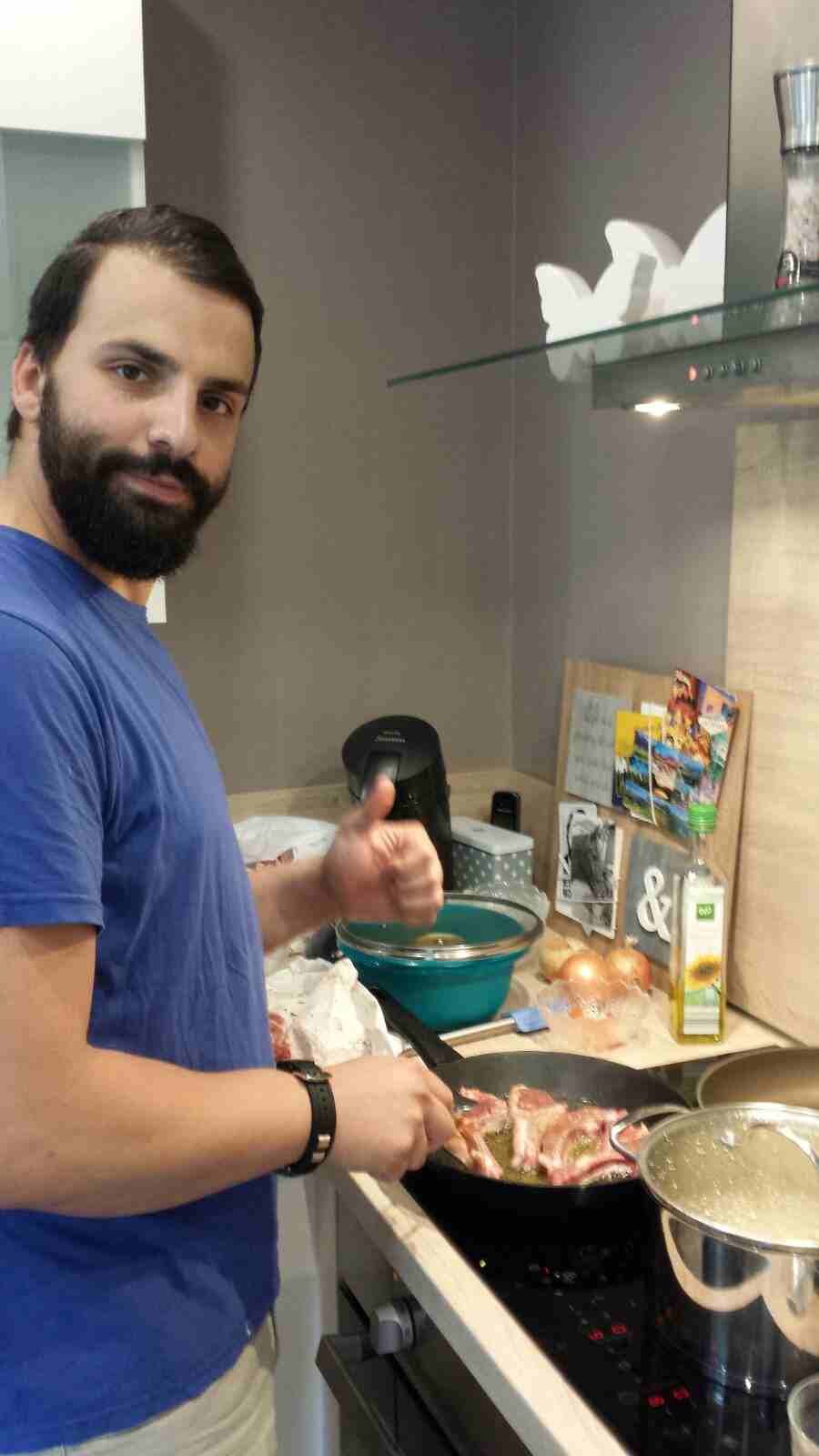 Voller Tatendrang haben wir gemeinsam mit unseren syrischen Spitzenköchen und unseren deutschen Freunden Kirsten und Ralf aus einer Küche ein kleines Schlachtfeld gezaubert. Gekocht wurde traditionelles, syrisches Essen. Es gab Fatteh (Huhn, Joghurt, Brot, Cashewkerne und jeeede Menge Knoblauch), Indian Kebab (Hackbällchen vom Lamm und Rind in einer Tomatensoße), frittierte Lammrippen und Tabouleh, ein Salat aus Petersilie, Tomaten, Bulgur und Pinienkernen.