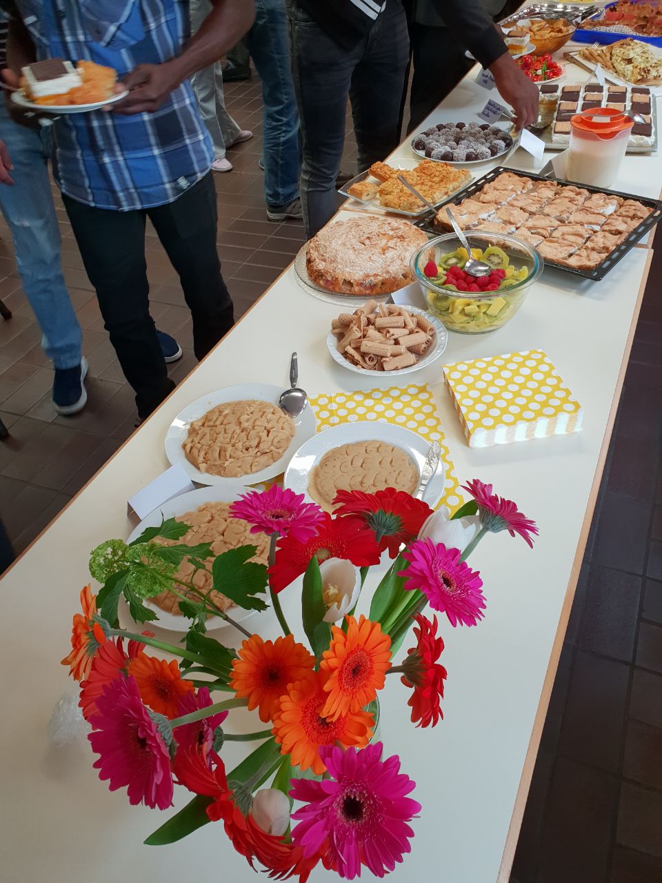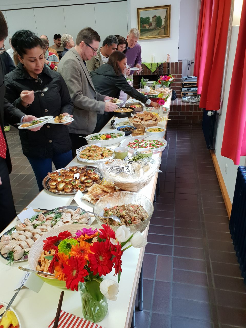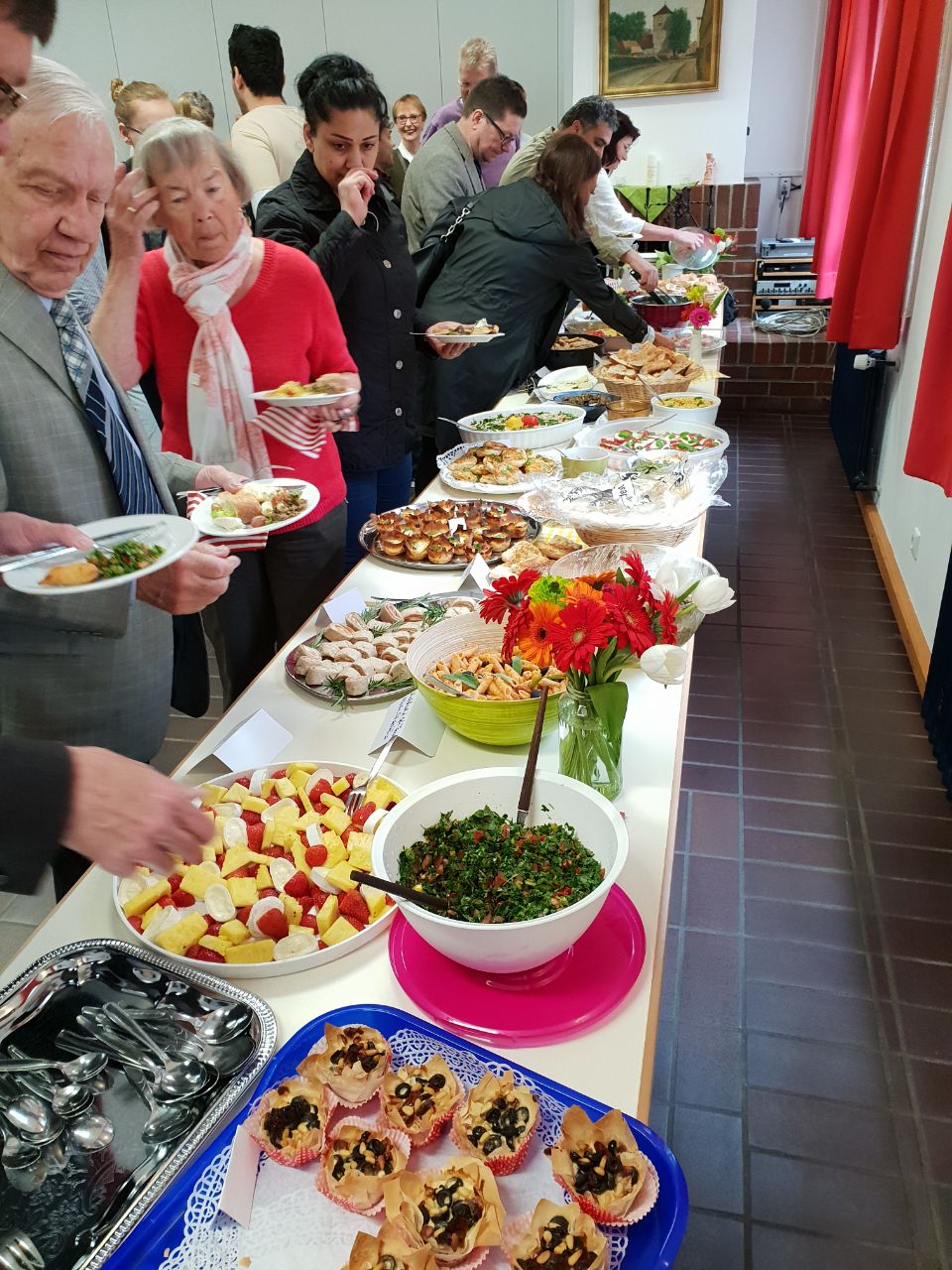 Menschen, Menschen, Menschen kamen. Viele Menschen vieler Nationen. Und alle brachten sie Köstlichkeiten aus ihrer Heimat mit. Ein unglaublich vielseitiges, interessantes und leckeres (!) Buffet entstand.