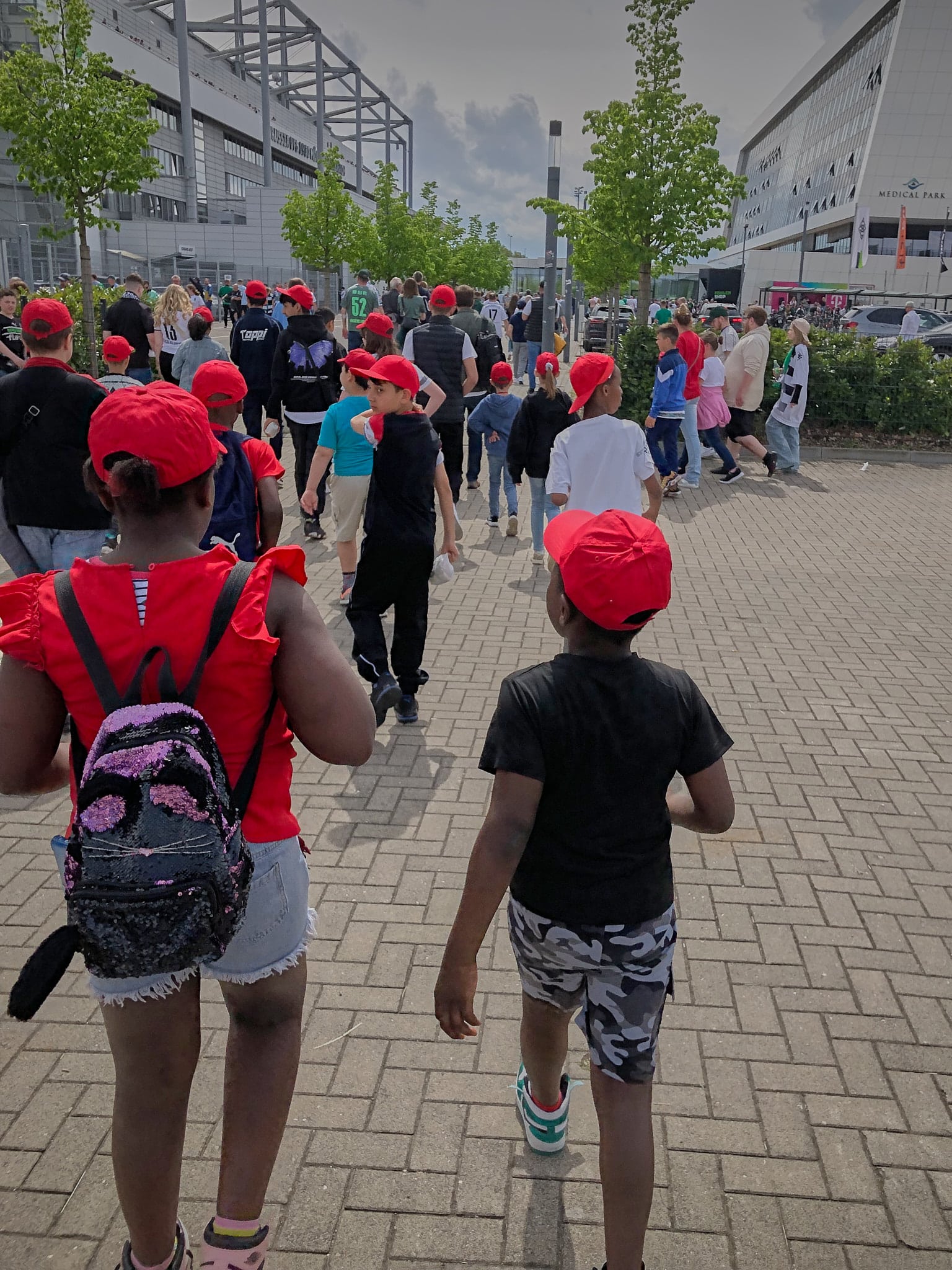 Auf der Hinfahrt saßen dann lauter vorfreudige Kinder und Jugendliche im Bus, die – kaum angekommen – im Borussiapark gleich ihren Job machten und optisch bereits als nicht zu schlagende, mächtige Rotkappen auftraten. Da die Vereinsfarben von Bochum Blau-Weiß sind, die von Borussia Schwarz-Weiß-Grün wird die Strategie der Schwalmtaler*innen im leuchtenden Rot direkt klar: „Wenn du sie nicht überzeugen kannst, verwirr sie.“ 😉