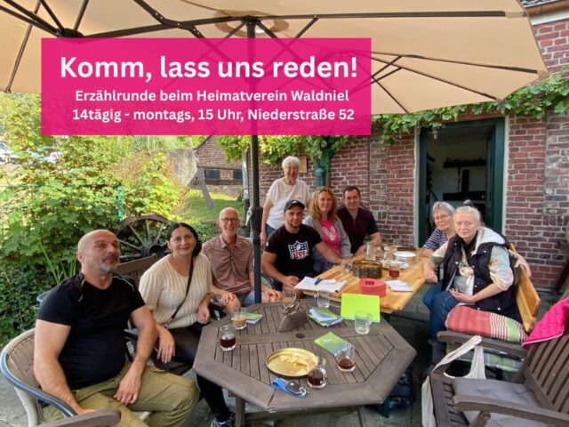 Ein neues Angebot für alle, die Deutsch lernen und sich mehr Praxis wünschen: die Erzählrunde in der Heimatstube, eine Kooperation zwischen dem Asylkreis Schwalmtal und dem Heimatverein Waldniel. Eingeladen sind Menschen aller Nationen. Wir reden miteinander, lernen uns kennen, tauschen uns aus. Kommt gerne vorbei – wir freuen uns auf euch. Die Gruppe trifft sich 14tägig, immer montags um 15 Uhr in der Heimatstube in der Niederstraße 52 in Waldniel.